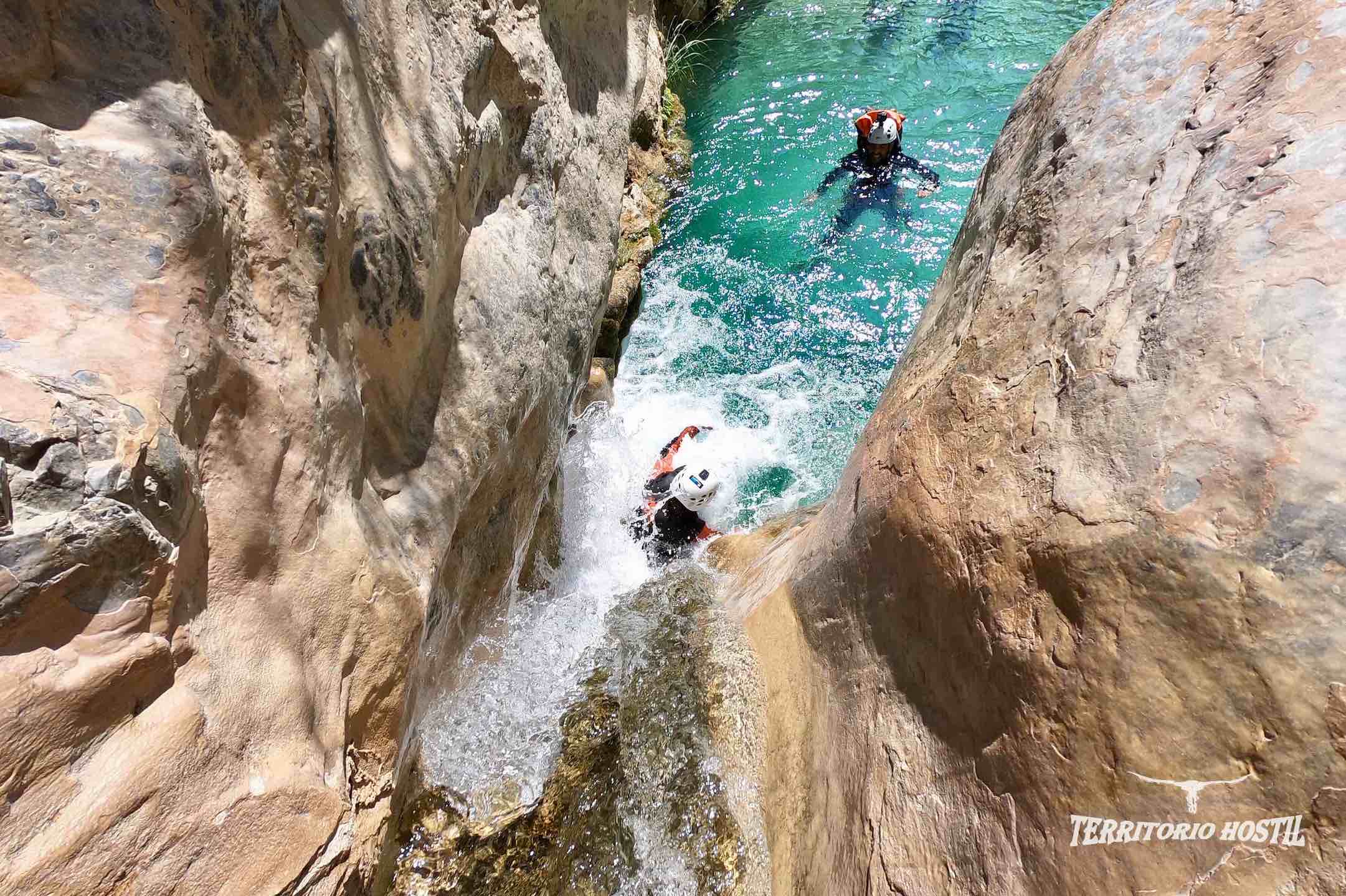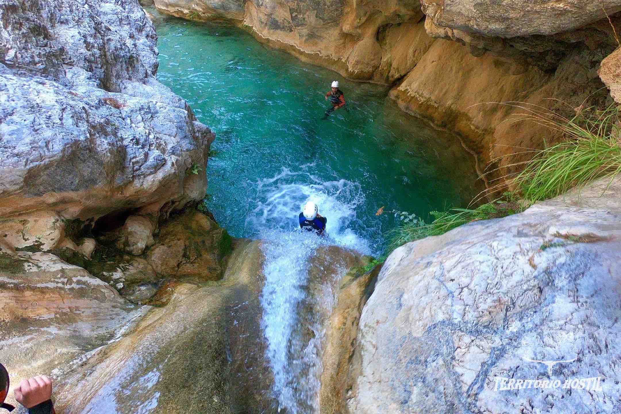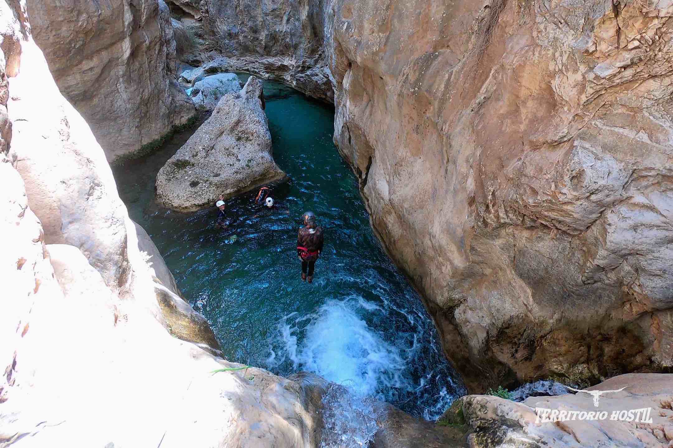 Nos pondremos los trajes en las pozas superiores e iniciaremos el descenso con el ansiado factor sorpresa de lo que nos espera durante las siguientes horas, en sus más de 3 km de tramo deportivo. Para los más atrevidos podremos terminar el barranco con diversos saltos voluntarios desde 5, 12, 14 y 16 metros en la última poza. Es el conocido salto de FE.