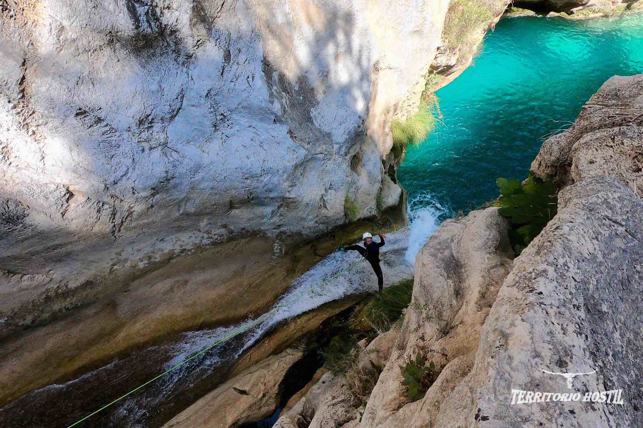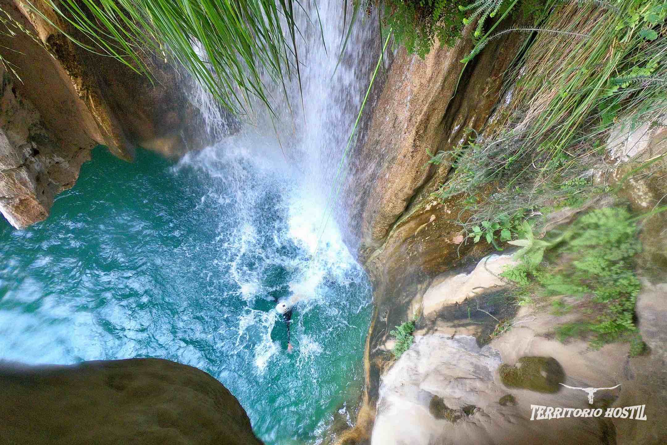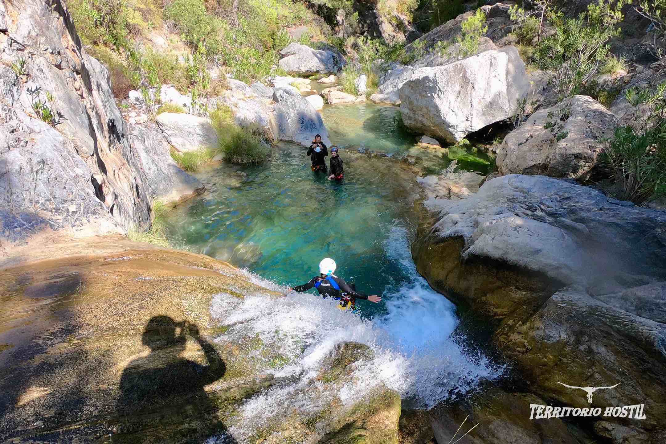 Nos pondremos los trajes en las pozas superiores e iniciaremos el descenso con el ansiado factor sorpresa de lo que nos espera durante las siguientes horas, en sus más de 3 km de tramo deportivo. Para los más atrevidos podremos terminar el barranco con diversos saltos voluntarios desde 5, 12, 14 y 16 metros en la última poza. Es el conocido salto de FE.