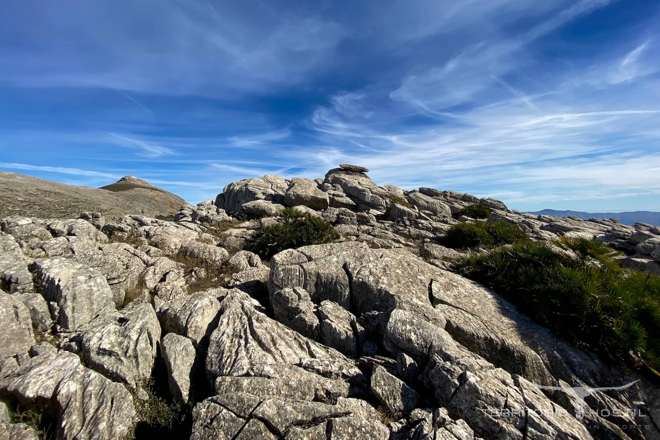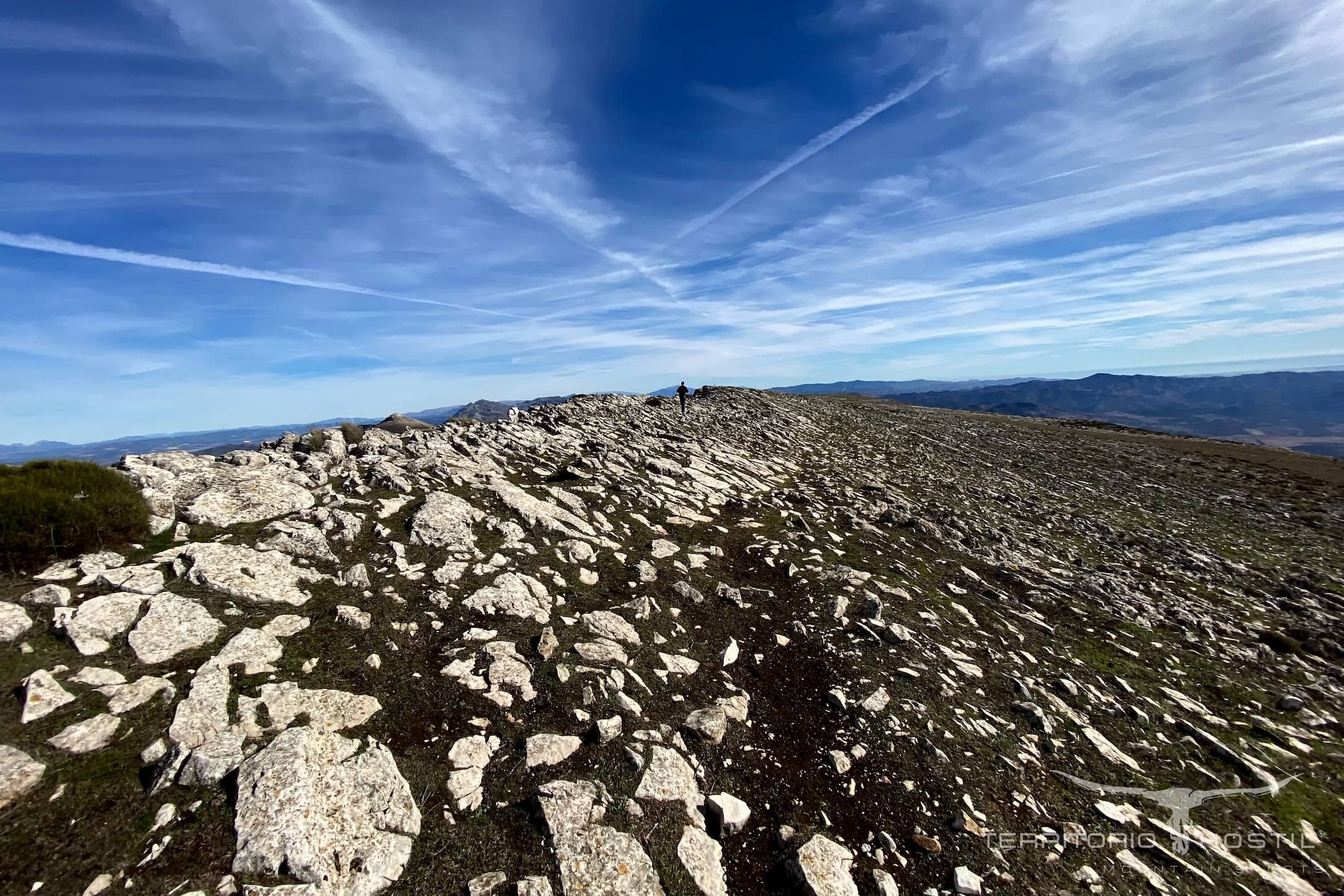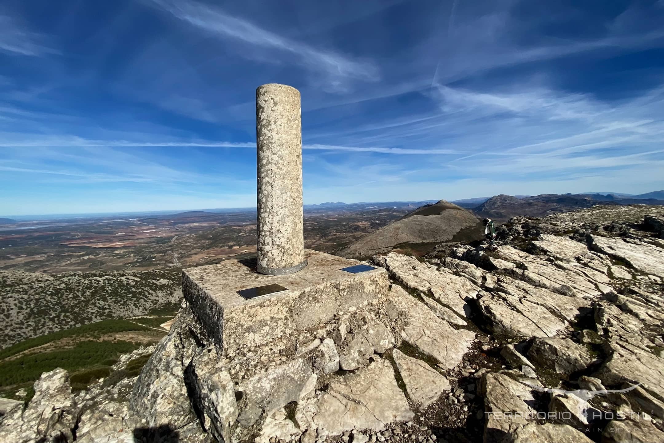Siguiendo la cresta alcanzamos el vértice geodésico Huma de esta cima amesetada. Desde esta cota tenemos preciosas vistas al noreste de la vecina Sierra de Abdalajís, destacando su imponente Pico Capilla (1186 m.)