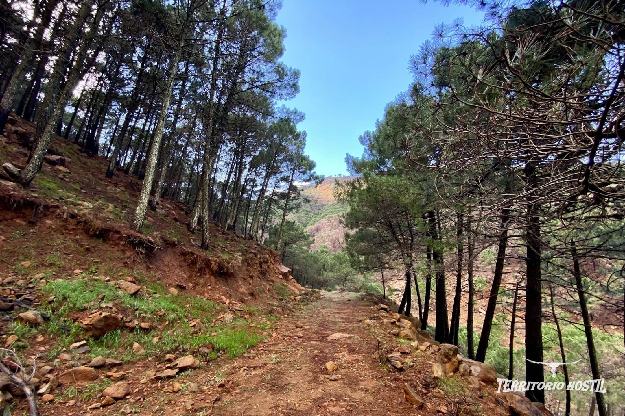 Iniciamos la ruta desde una pista forestal en la Garganta del Algarrobo y enlazaremos rápidamente con un sendero para remontar. Tras ascender por un espeso bosque, comenzamos a tener amplias panorámicas del tramo inferior de la Garganta del Algarrobo y el Alto del Porrejón.