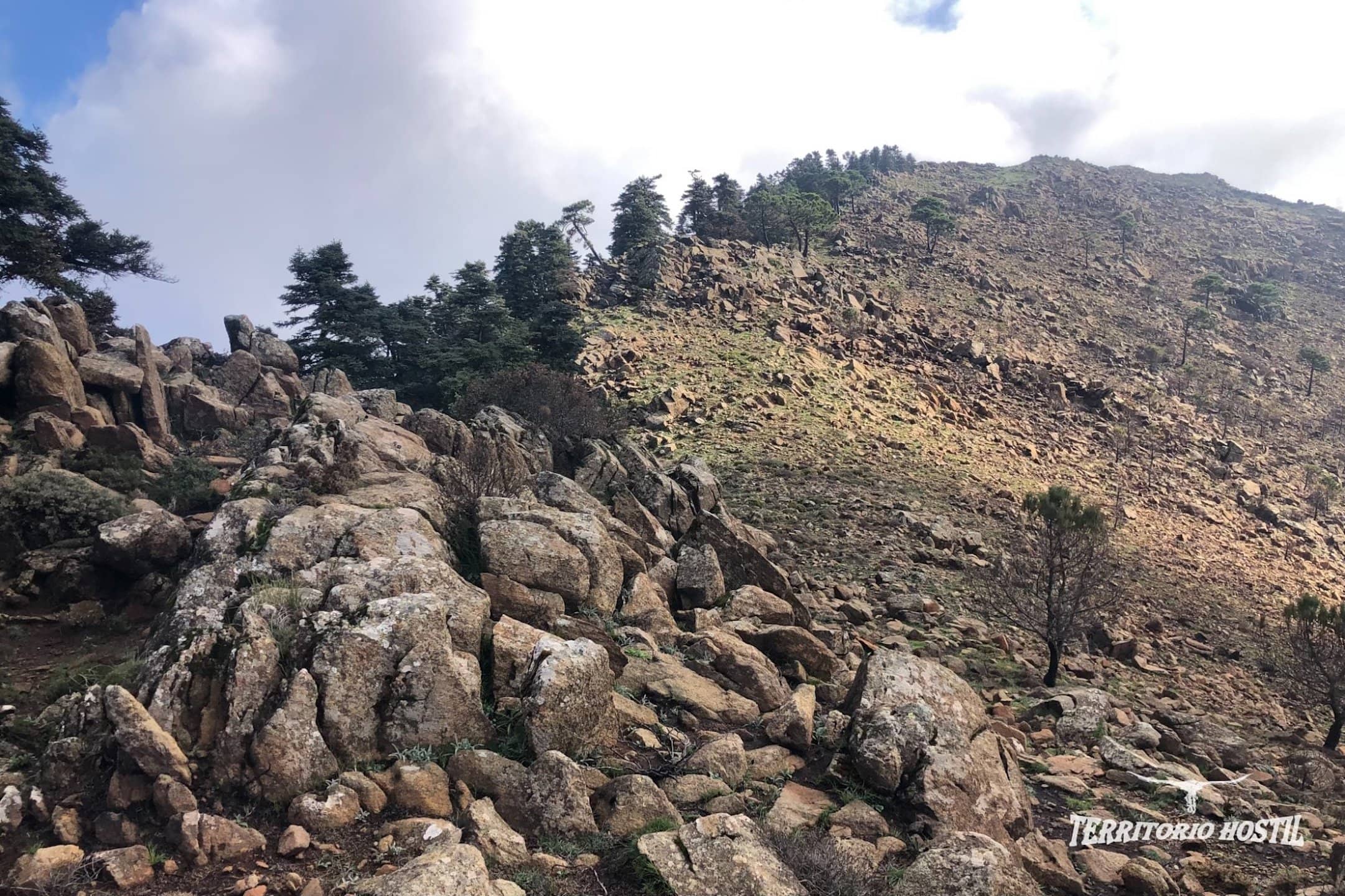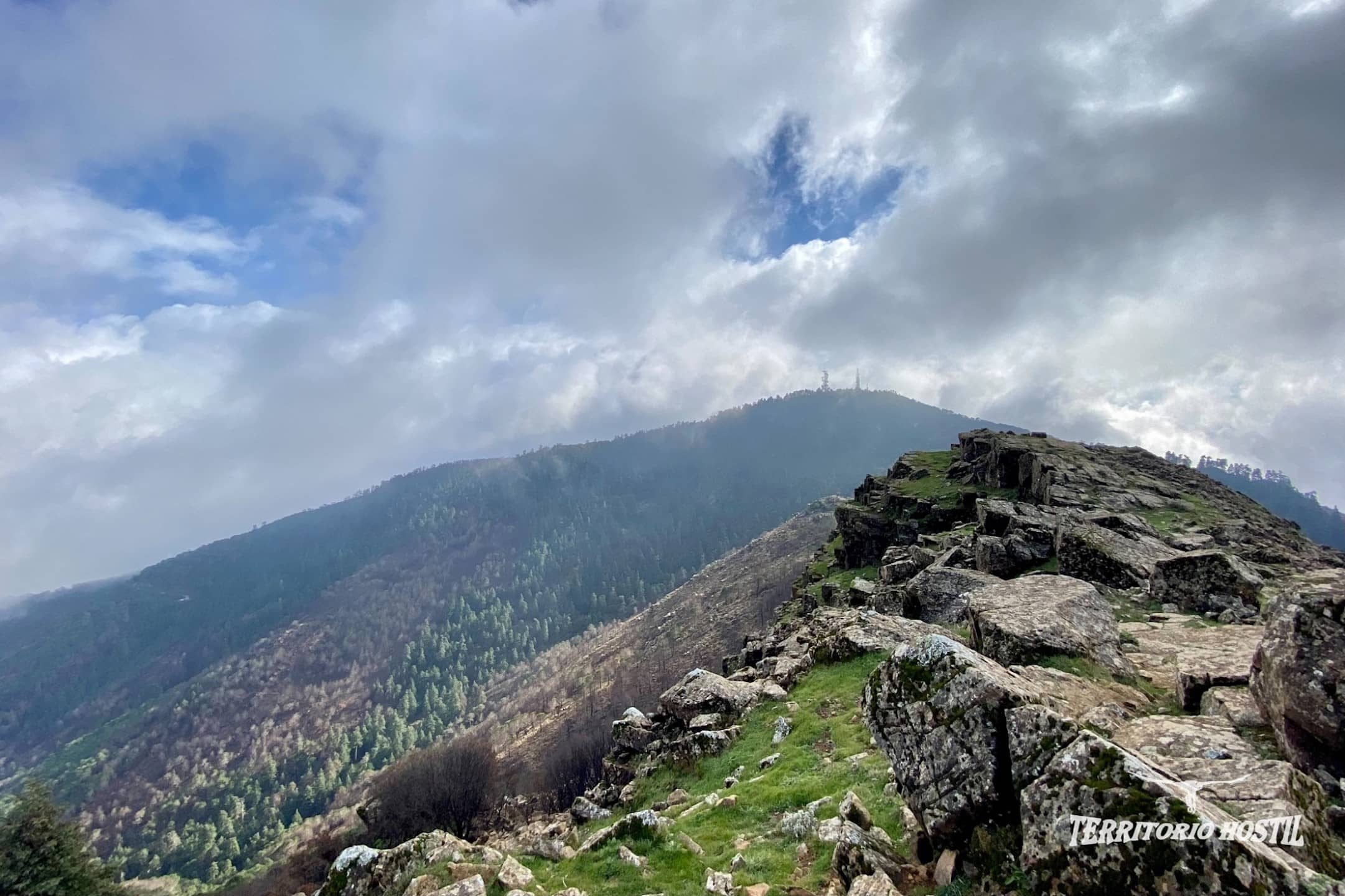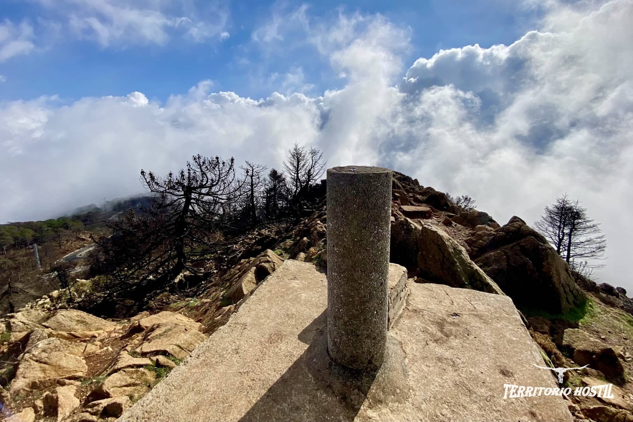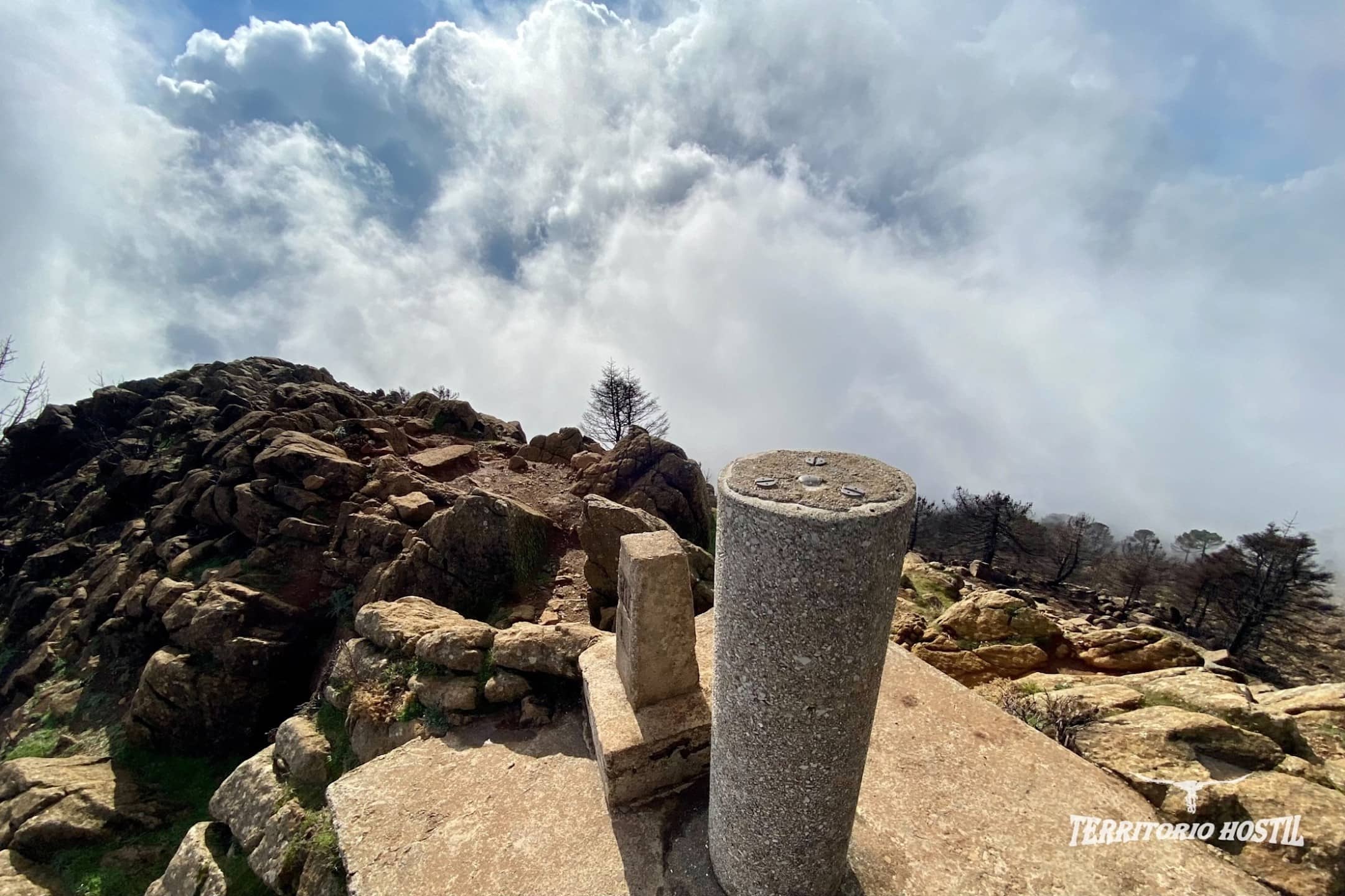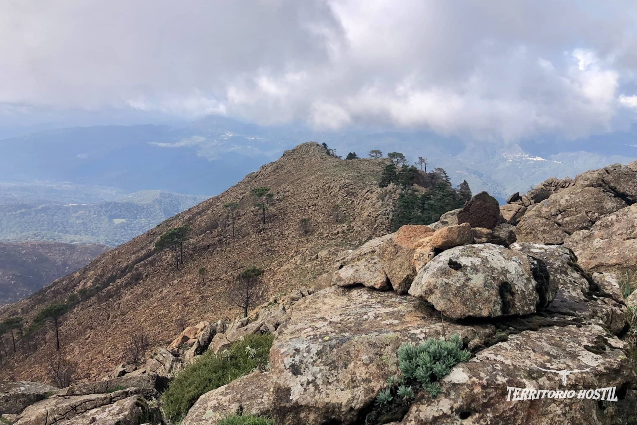 Al llegar a una pequeña angarilla ascendemos por una bonita cresta para culminar la cima del Cerro Los Realillos o también llamado Cerro del Castellón, contemplamos el Campo de Gibraltar y su peñón. En el horizonte incluso se puede divisar el Jebel Musa en la costa africana. Tras un leve descenso enlazando con un sendero bien marcado, nos queda una pequeña remontada y coronaremos el vértice geodésico del Pico Los Reales.