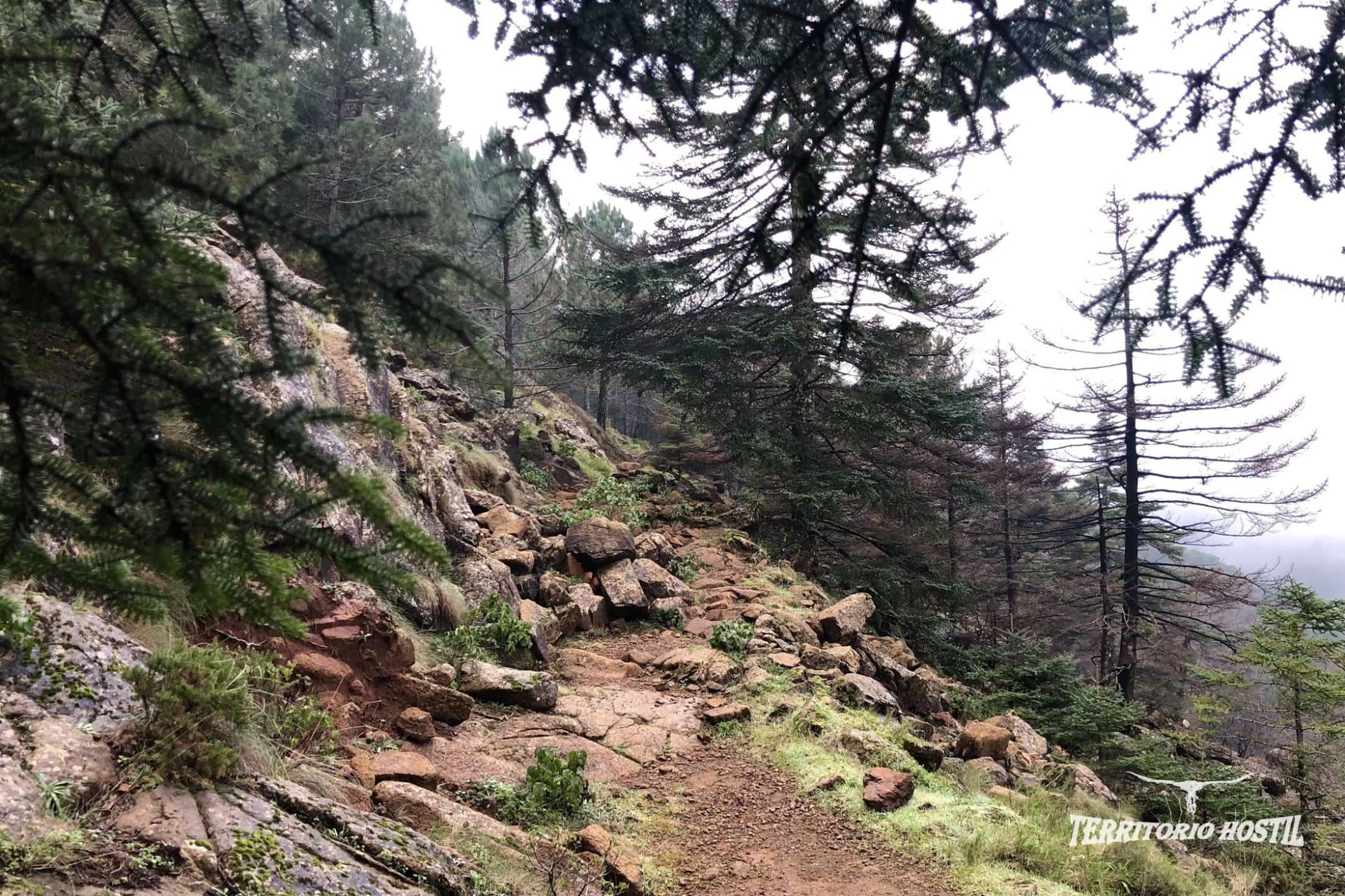 El itinerario transcurre un 70% por sendero terrizo y pedregoso, un 15% por pista pavimentada, un 10% por cortafuego rocoso y un 5% por pista terriza.
